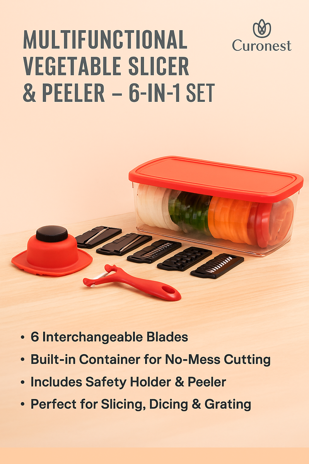 "Chop smarter, not harder! This all-in-one slicer comes with 6 sharp blades, a built-in container, and a peeler – making kitchen prep fast, safe, and mess-free!"