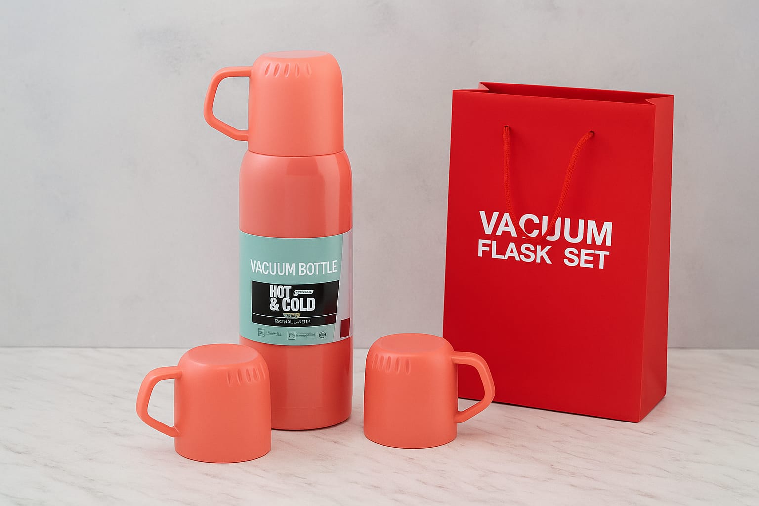 “Keep your drinks hot or cold for hours with this stylish vacuum flask set – complete with two handy mugs.”